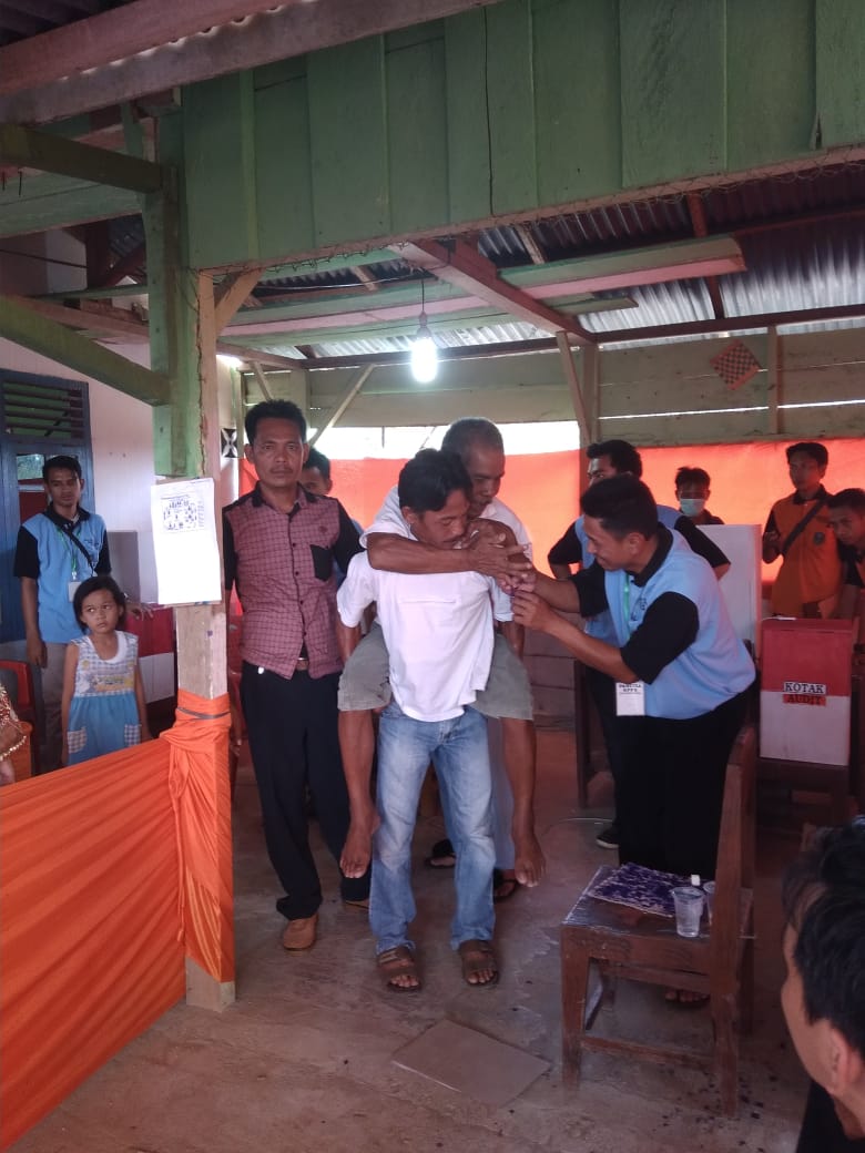 Wak Tomo yang turun dari kendaraan yang mengantarnya sekitar Pukul 13.40 WIB, kemudian langsung digendong anaknya bernama Agus Son menuju bilik suara untuk memilih Calon Kades, selesai mengklik ia kemudian digendong kembali menuju meja tinta untuk mendapat tanda bukti selesai memilih.