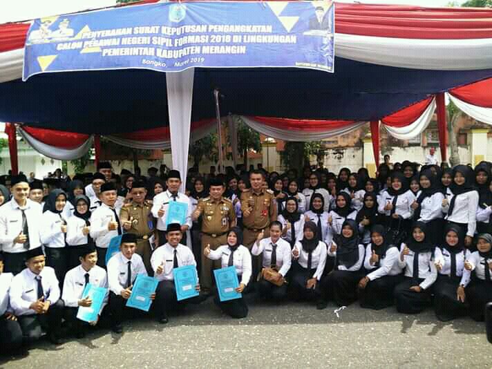 Bupati Merangin Al Haris menyerahkan Surat Keputusan (SK) Calon Pegawai Negeri Sipil (CPNS) formasi 2018 kepada 247 orang pada Lingkungan Pemerintah Kabupaten (Pemkab) Merangin Senin (25/3/2019).