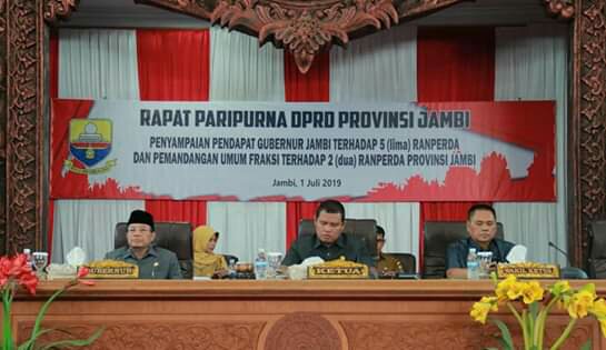 Hal itu disampaikannya dalam Rapat Paripurna Dewan Perwakilan Rakyat Daerah (DPRD) Provinsi Jambi dalam rangka Penyampaian Pendapat Gubernur Jambi terhadap 5 (Lima) Ranperda Inisiatif DPRD Provinsi Jambi dan Pandangan Umum Fraksi-fraksi terhadap 2 (Dua) Ranperda Provinsi Jambi, bertempat di Ruang Rapat Utama Gedung DPRD Provinsi Jambi, Senin (01/07/2019).