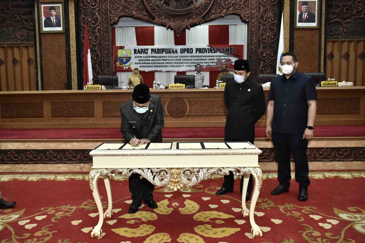 Nota kesepakatan ditandatangani oleh Gubernur Jambi, H.Fachrori Umar bersama Ketua DPRD Provinsi Jambi, Edi Purwanto,S.HI,M.Si dan Wakil Ketua DPRD Provinsi Provinsi Jambi, Pinto Jaya Negara.